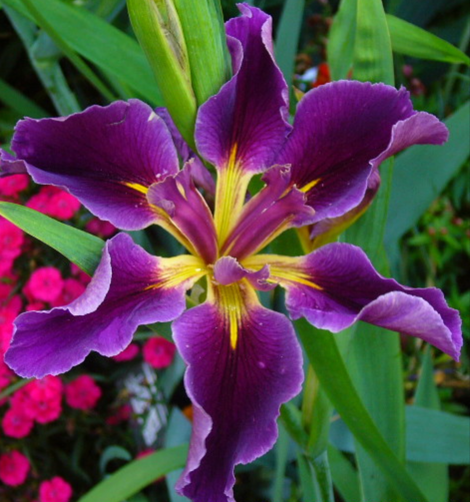 A very pleasant purple. Very dark red violet standards and falls with sight silver halo. Good garden presence. (Farron Campbell, R. 1998). 34-36" height and early to midseason bloomer.