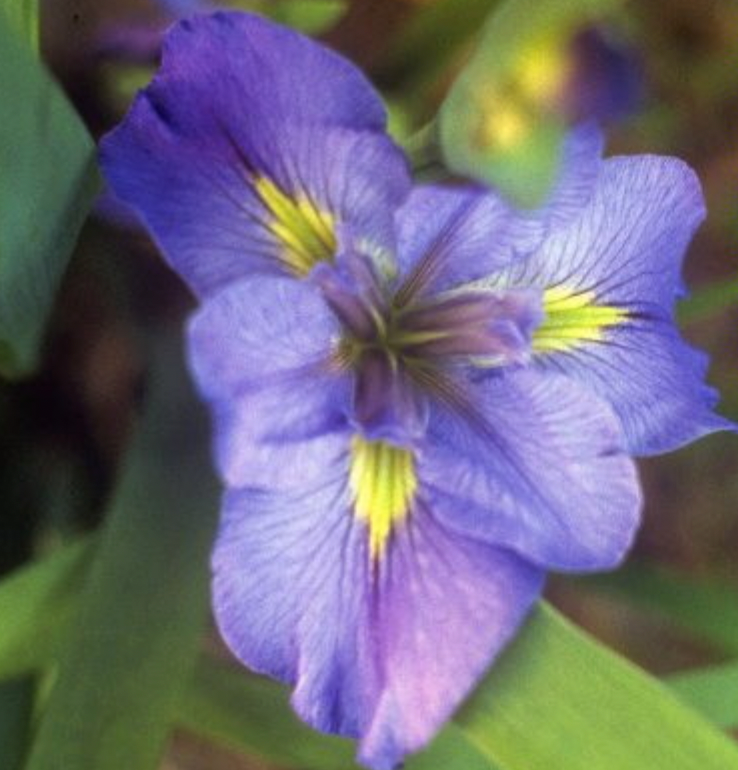 Lightly ruffled bluebird blue, Falls with large yellow steeple signal with green center.(Henry Rowlan by Comanche Acres, R. 1999) 34" height and midseason bloomer.