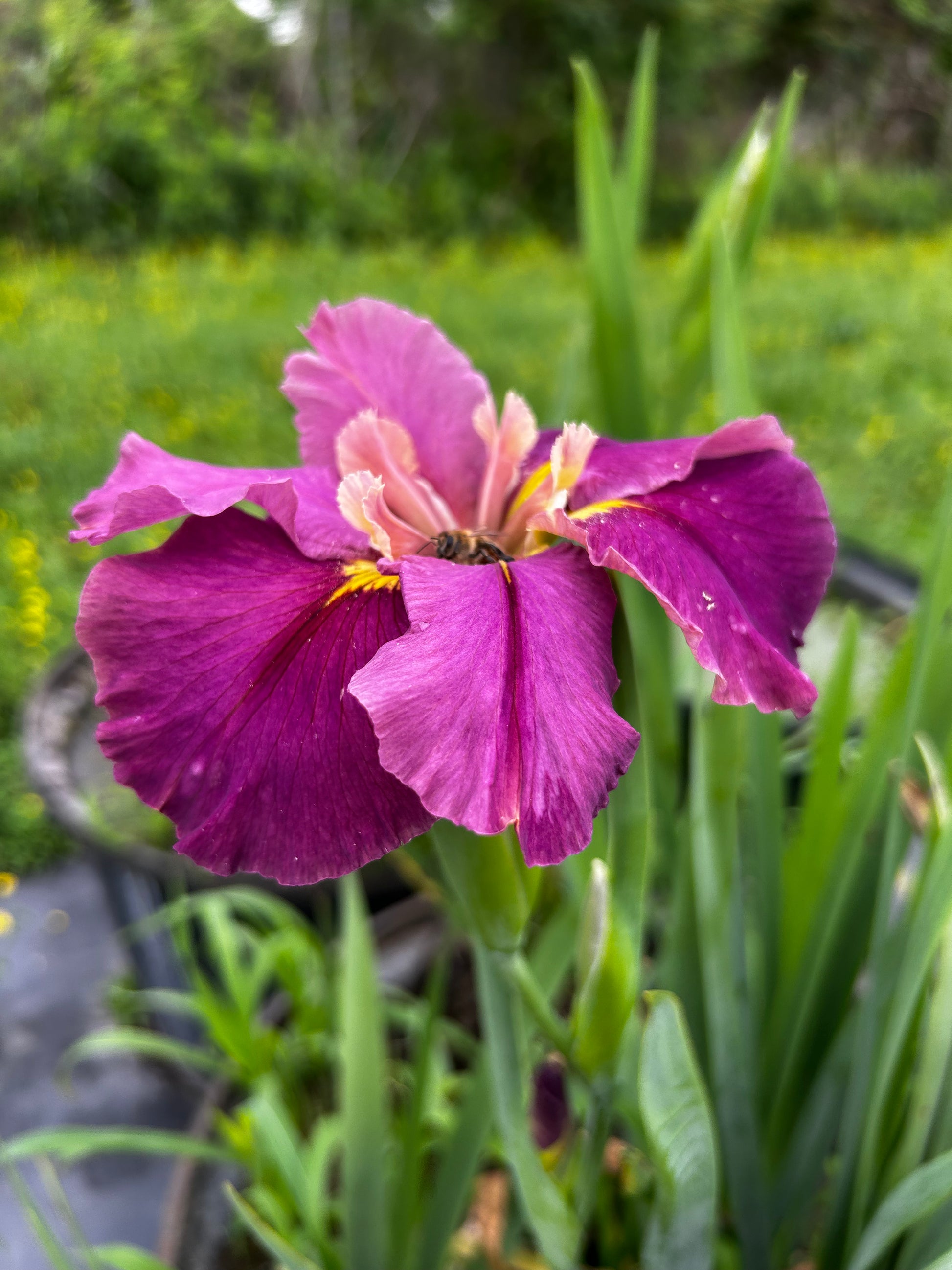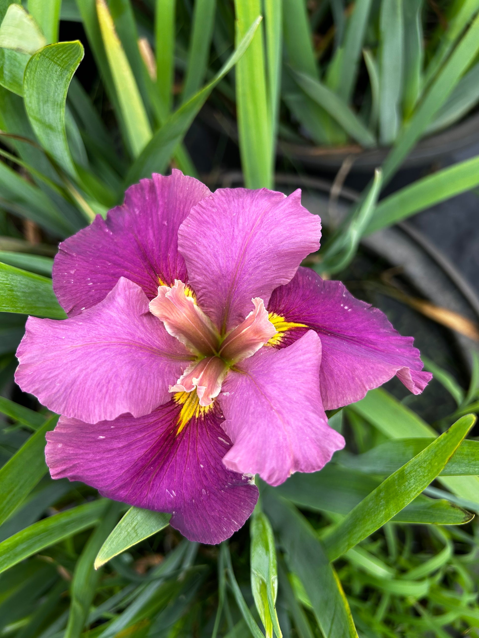 Standards mauve; blush pink style arms fading to lavender toward edge; Falls aster violet, mimosa yellow signal; ruffled (Neil Bertinot, R. 1981) 29.5" height and midseason bloomer.