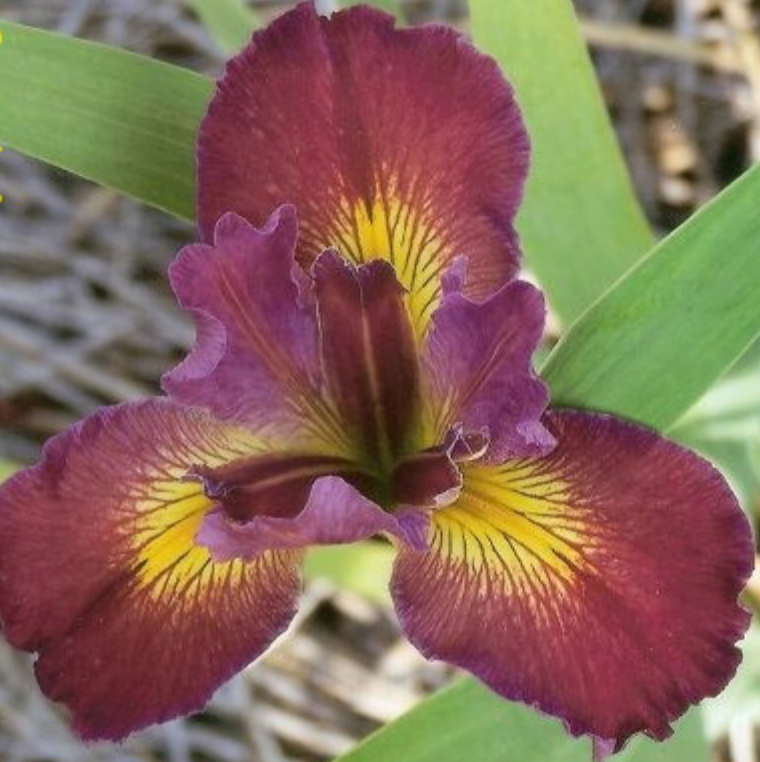 Ruffled indian lake red with large yellow sunburst signal. (Henry Rowlan, R. 1989). 32" height and midseason bloomer.