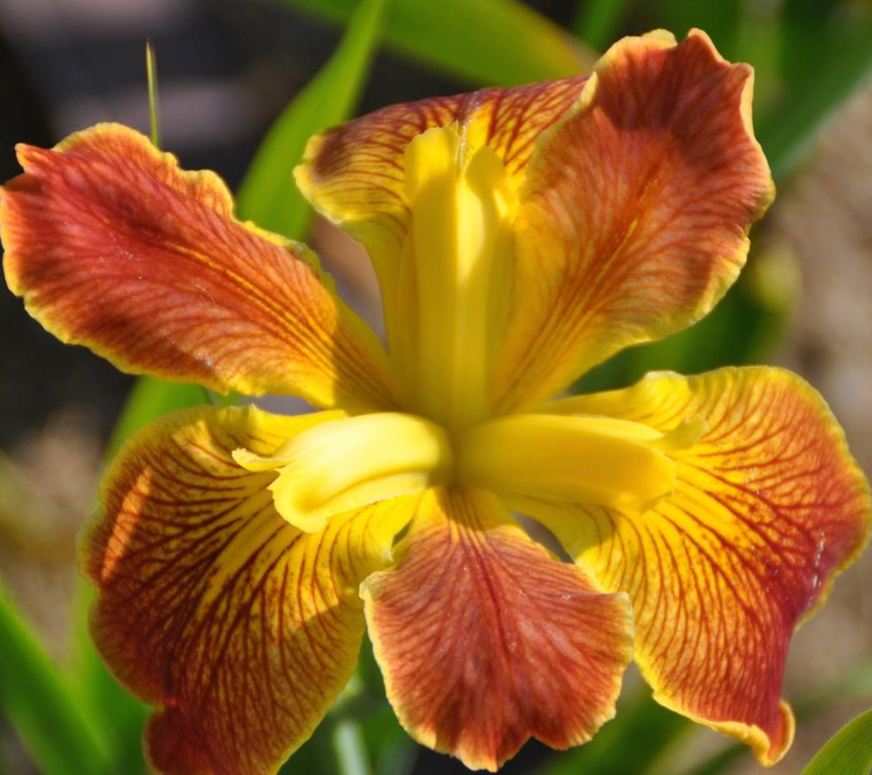 Stands red with narrow yellow edge, falls red with yellow veining and yellow sunburst signal. Style arms are an intense yellow. One of a kind. (Joseph Mertzweiller, R. 1992). 35" height and early to midseason bloomer.