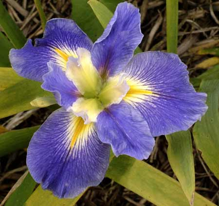 Ruffled falls mid-blue with large orange spear signal. (Mary Dunn, R. 1988) 30" height and mid season blooms.