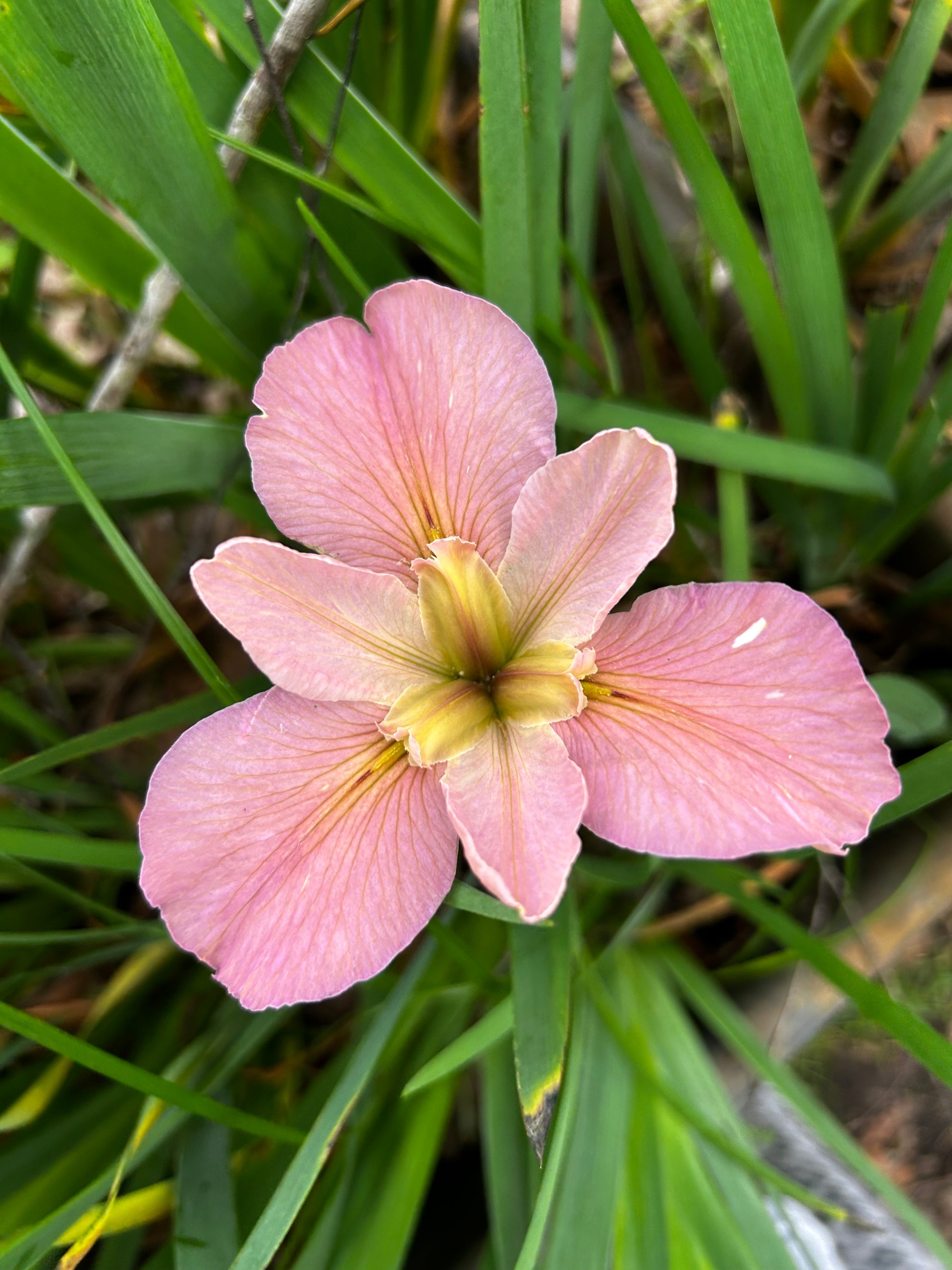 Small bloom. Standards pale pink, light wine center veins; style arms green becoming wine red toward center; falls pink, darker wine veining, wine center streak extending from signal, signal yellow green line narrowly outlined in deep wine. (Patrick O'Connor, R. 2004) 20-22" height and midseason bloomer.
