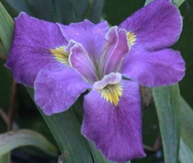 Lightly ruffled blue violet, veined dark violet; green yellow signal on cream ground; slight musky fragrance. (Joseph Mertzweiller, R. 1986). 34" height and early to midseason bloomer.