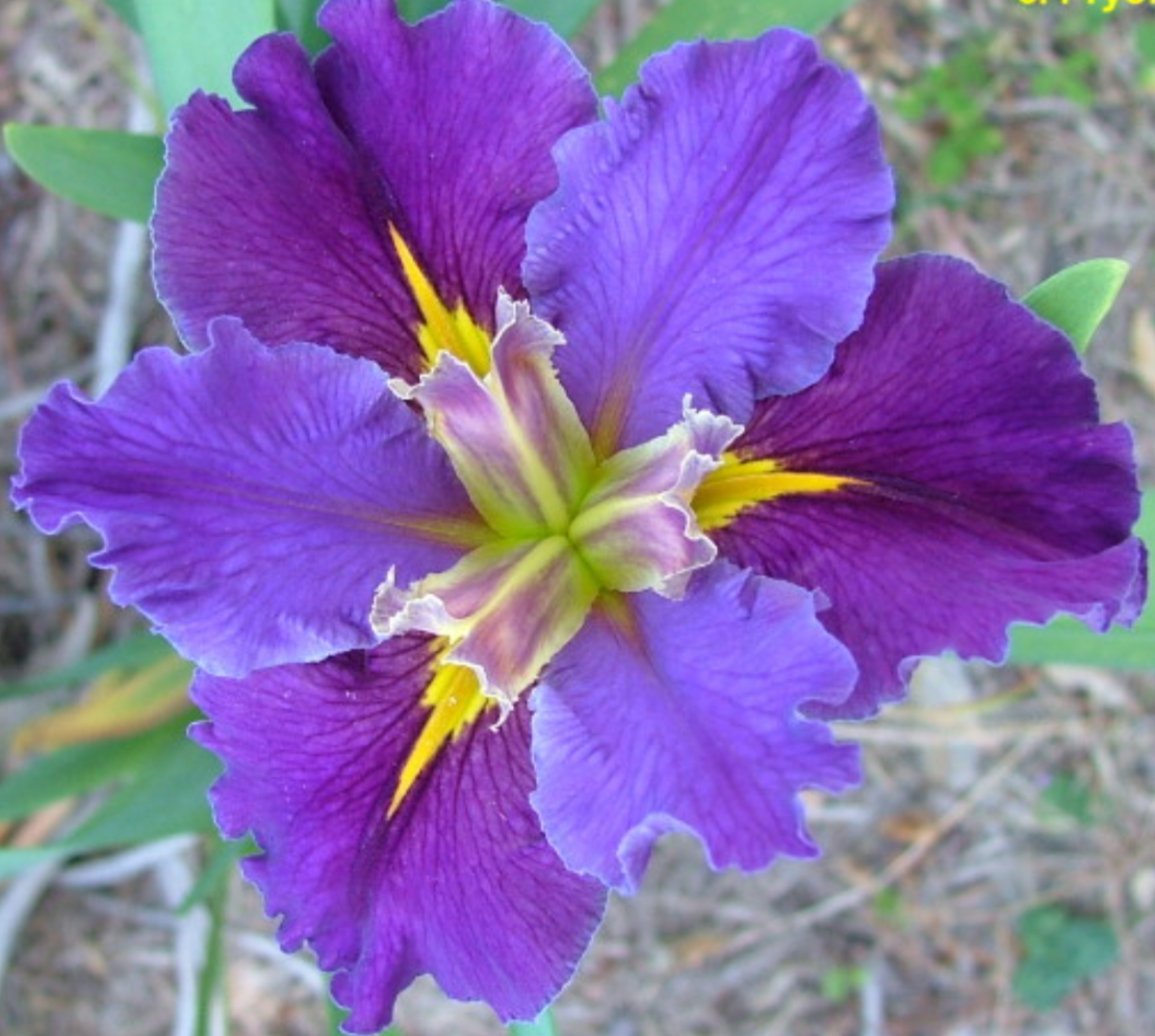 Stands medium violet, cream rim; falls deeper violet with white rim; golden yellow blotch signal with raised steeple. Style arms lemon blushed red violet on sides. Good grower. (Heather Pryor, R. 2000). 38" height and midseason bloomer.