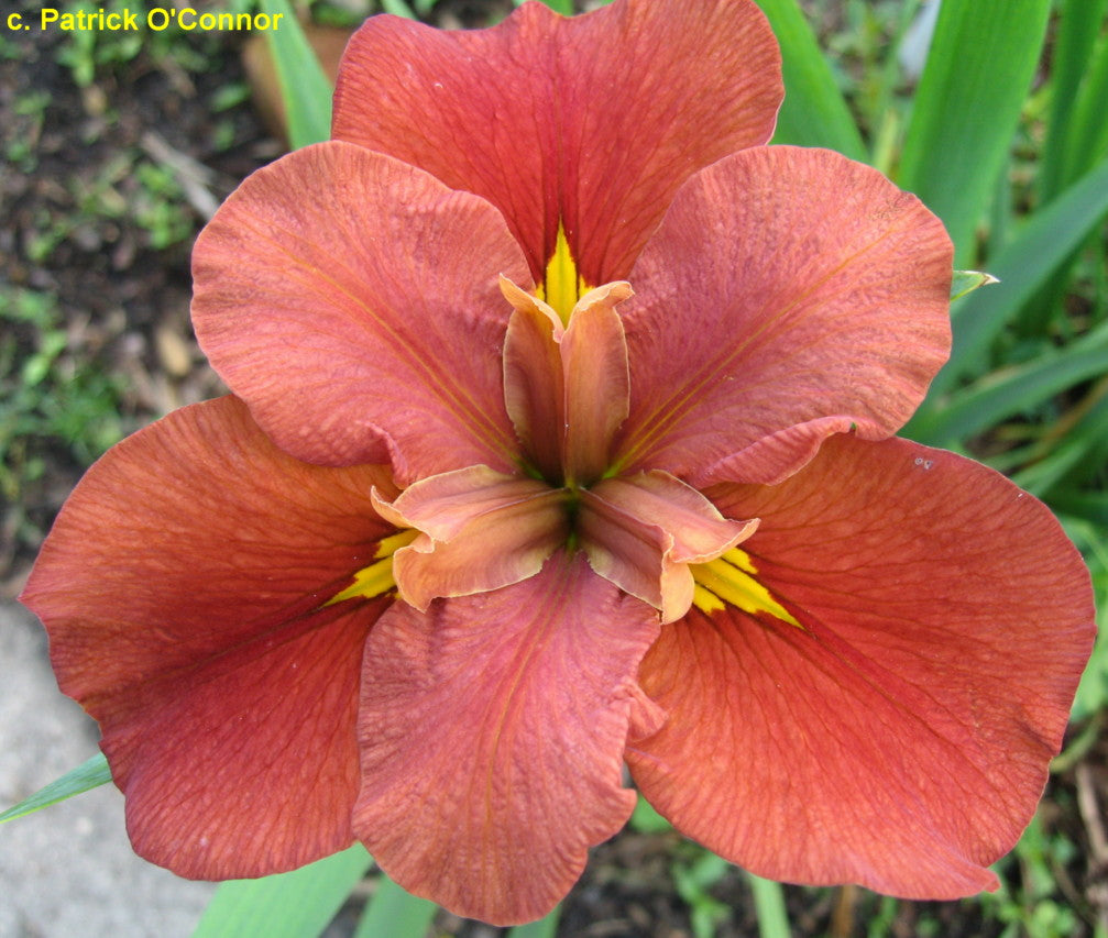 Red orange self with bright arrowhead yellow signal. Beautiful iris and color combines well with other color in bloom range. (Patrick O'Connor, R. 2013). 34-36" height and midseason bloomer.