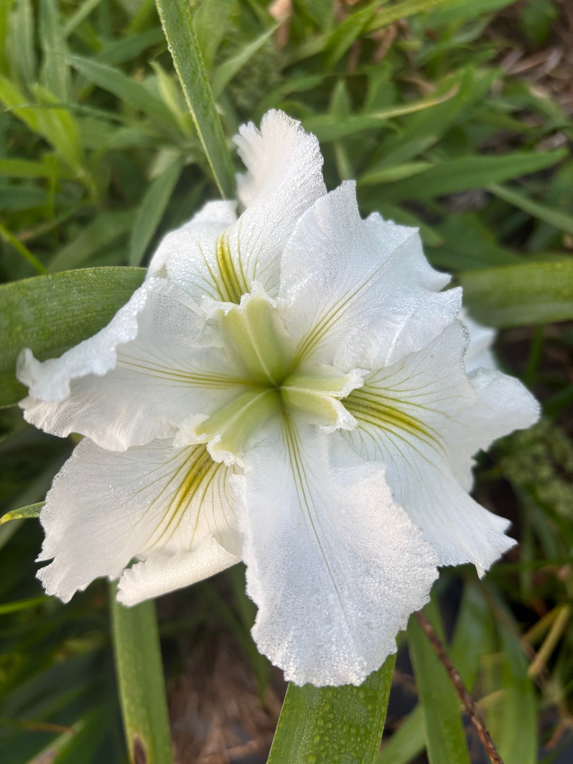 Standards white, tailored; style arms green and white; Falls same as standards, yellow signal. (Hooker Nichols, R. 2013) 38" height and midseason to late bloomer.
