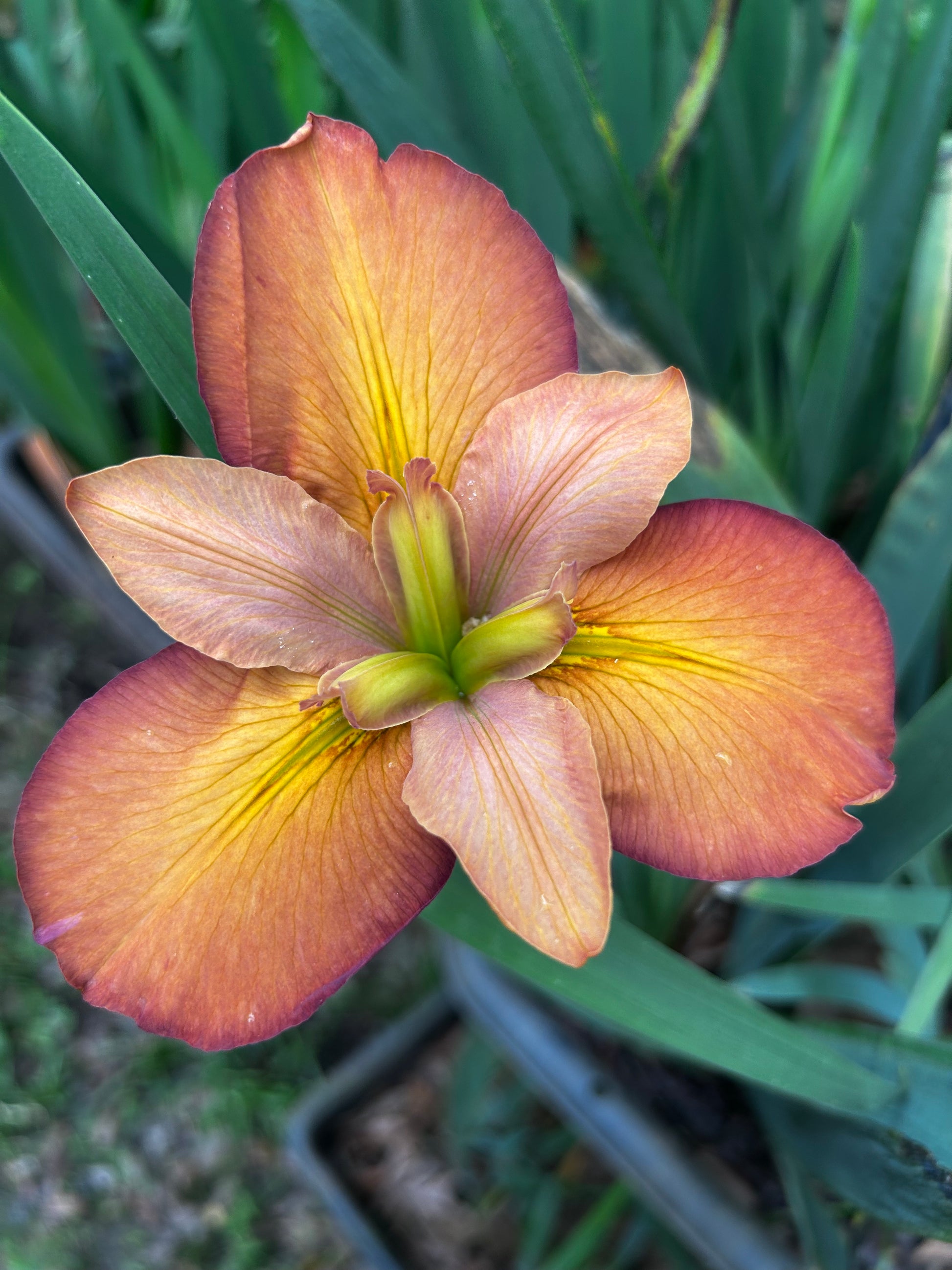 Standards and falls set in light terracotta with yellow signal diffusing from beginning to end. Signal becoming more dominant as flower ages, greenish yellow steeple signal; yellow reverse; slight fragrance. (Richard Morgan by Melody & Jerry Wilhoit, R. 2009) 22" height and midseason bloomer.