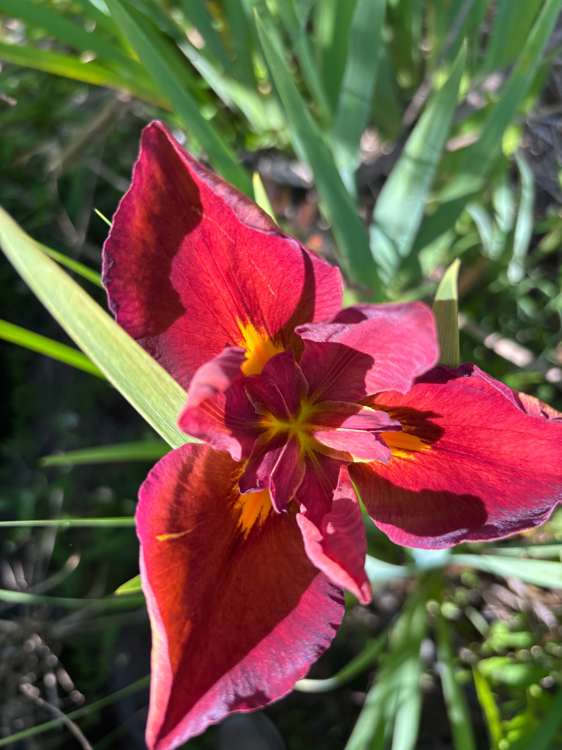 Standards orange buff base overlaid with deeper red orange veining; style arms red orange to orange buff; falls red orange, large yellow orange arrowhead signal with short deep red orange line marking at tip (Patrick O'Connor, R. 2001) 37" height and midseason bloomer.